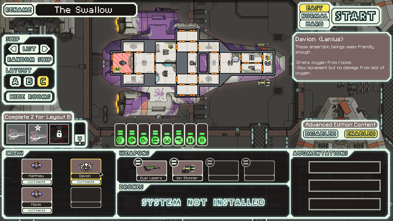 All player ships start with piloting engines oxygen and weapons control. Systems are equipment that provides your ship with capabilities. Crystal burst mk i crystal a 2 shots with 1 shield pierce but long cooldown and can be stopped by defense drones. Each ship starts with varying systems weapons power levels. Mantis b has the best starting defenses of any ship and the insanely good 4 man teleporter. Ive started playing ftl again after a half year hiatus.